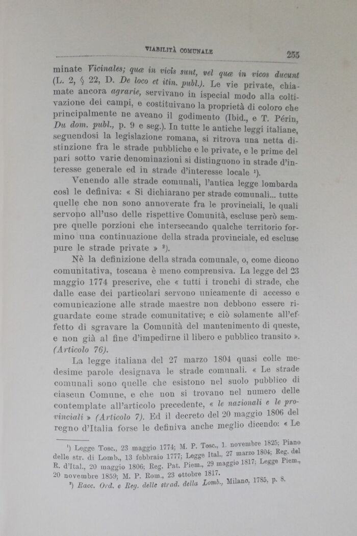 minate Vicinales; qua in vieU sunt, vel qua in vicos ducuta (L. 2, $ 22, D. De loco et itin. pubi). Le vie private, chia-mate ancora agrarie, servivano in ispecial modo alla coltivazione dei campi, e costituivano la proprietà di coloro che principalmente ne aveano il godimento (Ibid., e T Périn Du dom. pubi, p. <) e seg.). In tutte le antiche leggi italiane seguendosi la legislazione romana, si ritrova una netta distinzione fra le strade pubbliche e le private, e le prime del pari sotto varie denominazioni si distinguono in strade d'interesse generale ed in strade d'interesse locale >).