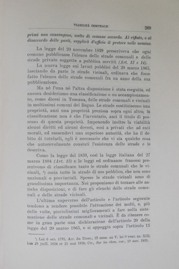 Come la legge del 1851), così la legge italiana del 27 marzo 1804 (Art. 13) e le leggi ed ordinanze francesi prescrivono di classificare tanto le strade comunali che le vicinali, x) ossia tutte le strade di uso pubblico, che non sono nazionali o provinciali. Spesso le strade vicinali sono di grandissima importanza. Noi proponiamo di tornare alle antiche disposizioni, e di fare gli elenchi delle strade comunali e delle strade vicinali.