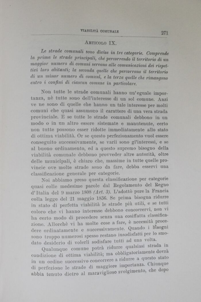 Noi abbiamo preso questa classificazione per categorie quasi colle medesime parole dal Regolamento del Regno d'Italia del !) marzo 1808 (Art. 3). L'adottò pure la Francia colla legge del 21 maggio 1836. Se prima bisogna ridurre in stato di perfetta viabilità le strade più utili, e se tutti coloro che vi hanno interesse debbono concorrervi, non vi ha certo modo di procedere senza una cosiffatta classificazione. Allorché vi ha molte cose a fare, è necessità procedere ordinatamente e successivamente. Quando i bisogni sono troppo numerosi spesso restano insodisfatti per lo smodato desiderio di volerli sodisfare tutti ad una volta.