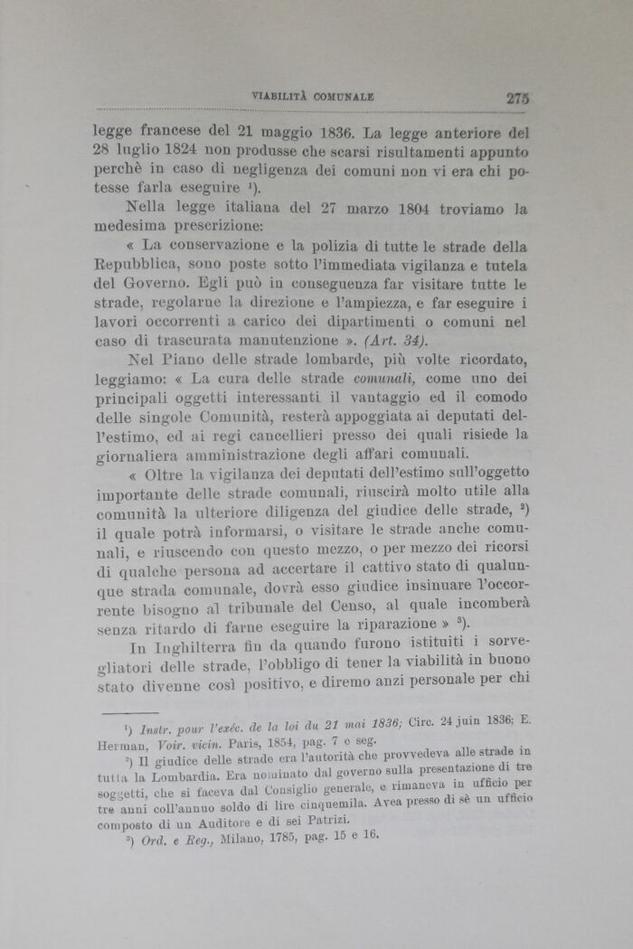 In Inghilterra fin da quando furono istituiti i sorvegliatoli delle strade, l'obbligo di tener la viabilità in buono stato divenne cosi positivo, e diremo anzi personale per chi