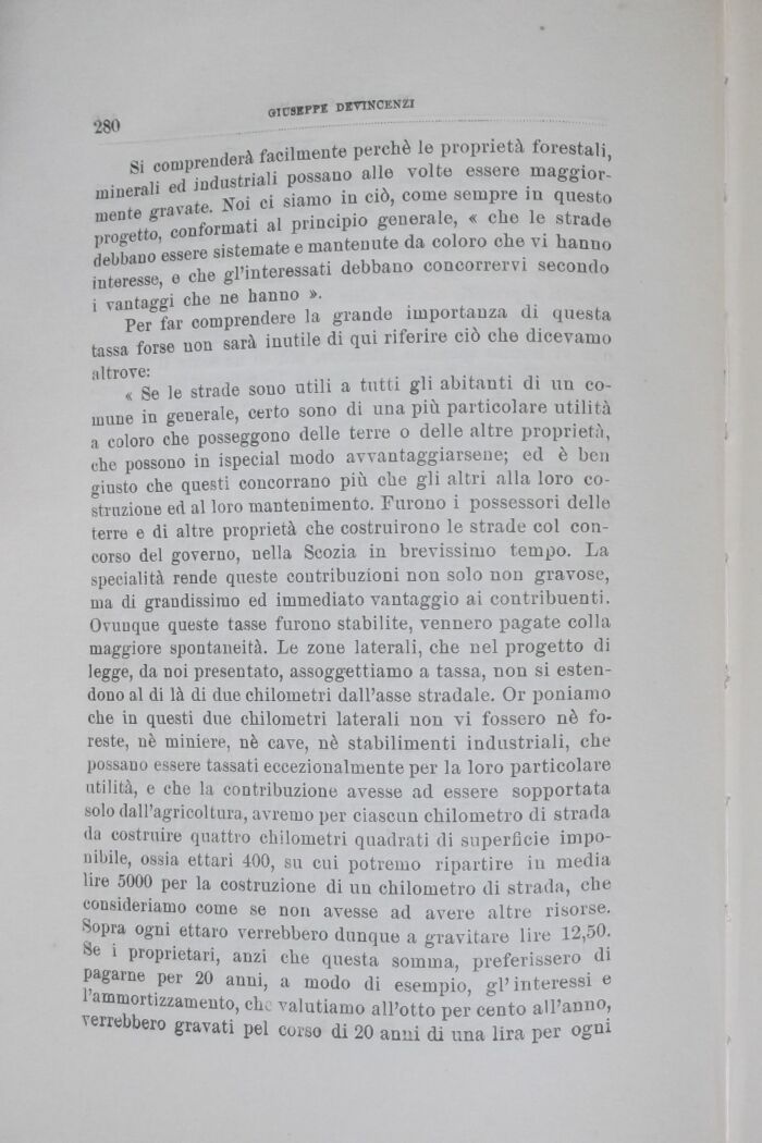 « Se le strade sono utili a tutti gli abitanti di un comune in generale, certo sono di una più particolare utilità a coloro che posseggono delle terre o delle altre proprietà, che possono in ispecial modo avvantaggiarsene; ed è ben giusto che questi concorrano più che gli altri alla loro costruzione ed al loro mantenimento. Furono i possessori delle terre e di altre proprietà che costruirono le strade col concorso del governo, nella Scozia in brevissimo tempo. La specialità rende queste contribuzioni nou solo uou gravose, ma di grandissimo ed immediato vantaggio ai contribuenti. Ovunque queste tasse furono stabilite, vennero pagate colla maggiore spontaneità. Le zone laterali, che nel progetto di legge, da noi presentato, assoggettiamo a tassa, non si estendono al di là di due chilometri dall'asse stradale. Or poniamo che in questi due chilometri laterali uon vi fossero nè foreste, uè miniere, nè cave, nè stabilimenti industriali, che possano essere tassati eccezionalmente per la loro particolare utilità, e che la contribuzione avesse ad essere sopportata solo dall'agricoltura, avremo per ciascun chilometro di strada du costruire quattro chilometri quadrati di superficie imponibile, ossia ettari 400, su cui potremo ripartire in media lire 5000 per la costruzione di uu chilometro di strada, che consideriamo come se non avesse ad avere altre risorse. " M>pra ogni ettaro verrebbero dunque a gravitare lire 12,50. «e i proprietari, anzi che questa somma, preferissero di