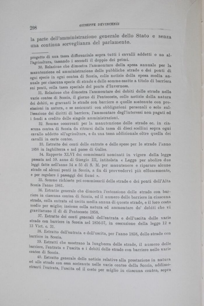 30. Relazione che dimostra l'ammontare della spesa annuale per la manutenzione ed amministrazione delle pubbliche strade e dei ponti di ogni specie in ogni contea di Scozia, colle notizie della spesa media annuale per ciascuna specie di strade e delle somme esatte a titolo di barriera sui ponti, colla tassa speciale del ponte d'Inverness.