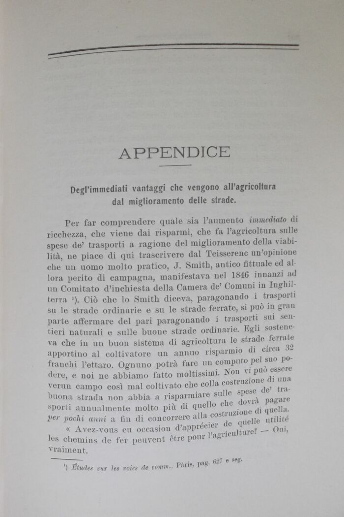 Per far comprendere quale sia l'aumento immediato di ricchezza, che viene dai risparmi, che fa l'agricoltura sulle spese de' trasporti a ragione del miglioramento della viabilità, ne piace di qui trascrivere dal Teisserenc un'opinione che un uomo molto pratico, J. Smith, antico Attuale ed al lora perito di campagna, manifestava nel 1846 innanzi ad un Comitato d'inchiesta della Camera de' Comuni in Inghilterra '). Ciò che lo Smith diceva, paragonando i trasporti su le strade ordinarie e su le strade ferrate, si può in gran parte affermare del pari paragonando i trasporti sui sentieri naturali e sulle buone strade ordinarie. Egli sosteneva che in un buon sistema di agricoltura le strade ferrate apportino al coltivatore un annuo risparmio di circa 32 franchi l'ettaro. Ognuno potrà fare un computo pel suo podere, e noi ne abbiamo fatto moltissimi. Non vi può essere veruu campo così mal col ti vato che colla costruzione^li una buona strada non abbia a risparmiare sulle spese de rapporti annualmente molto più di quello che dovrà pag. Per pochi anni a fin di concorrere alla costruzione di qnei».