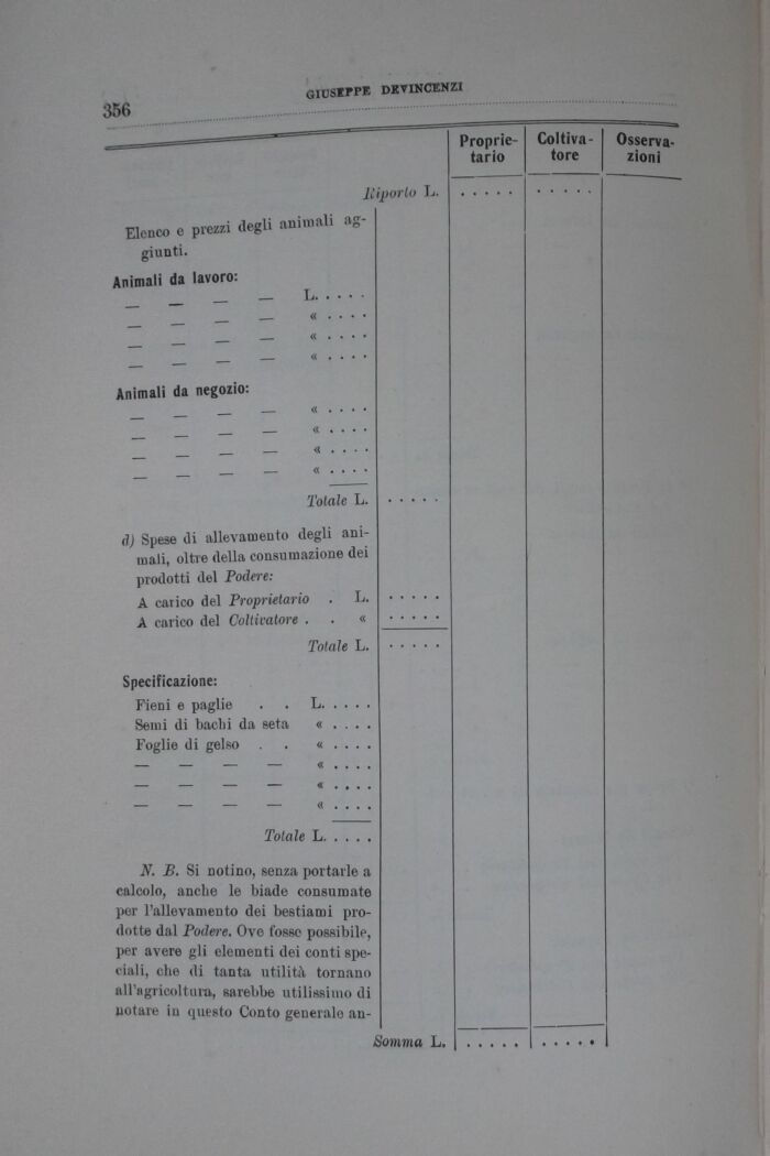 N. B. Si notino, senza portarle a calcolo, anche le biade consumate por l'allevamento dei bestiami prodotte dal Podere. Ove fosse possibile, per avere gli elementi dei conti spedali, che di tanta utilità tornano all'agricoltura, sarebbe utilissimo di notare in questo Conto generale an-
