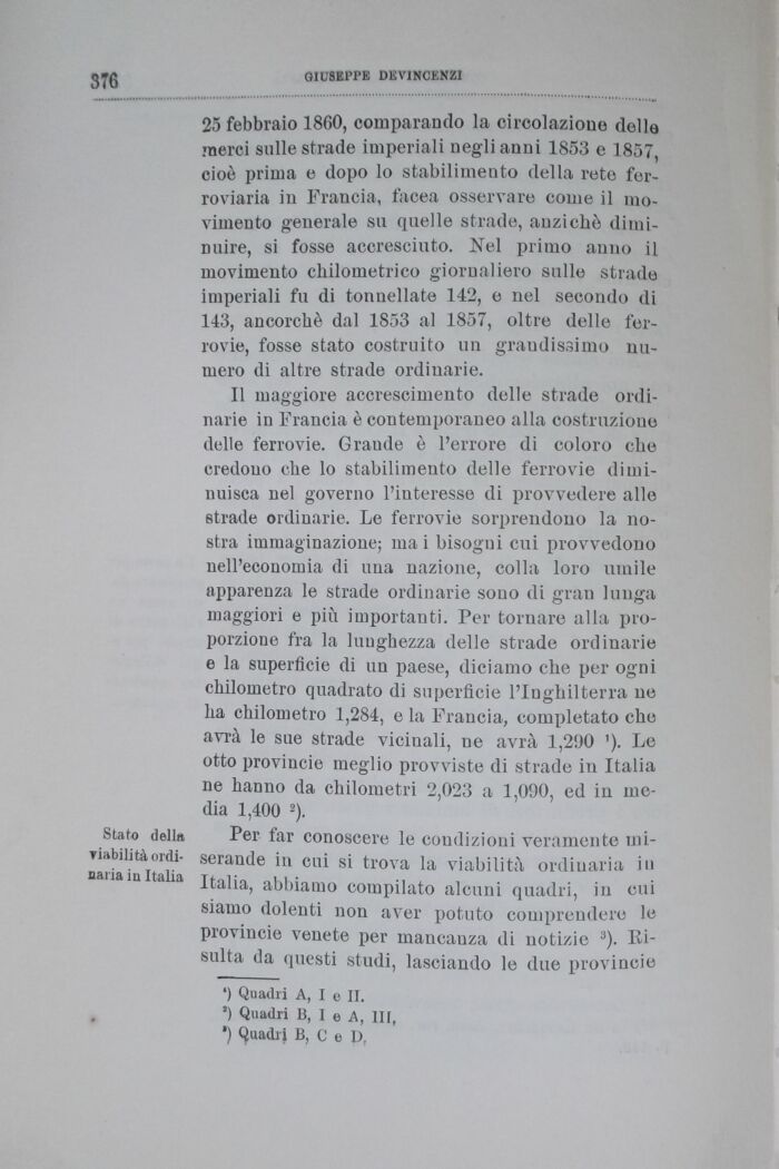 Il maggiore accrescimento delle strade ordinarie in Francia é contemporaneo alla costruzione delle ferrovie. Grande è Terrore di coloro che credouo che lo stabilimento delle ferrovie diminuisca nel governo l'interesse di provvedere alle strade ordinarie. Le ferrovie sorprendono la nostra immaginazione; mai bisogni cui provvedono nell'economia di una nazione, colla loro umile apparenza le strade ordinarie souo di gran lunga maggiori e più importanti. Per tornare alla proporzione fra la lunghezza delle strade ordinarie e la superficie di un paese, diciamo che per ogni chilometro quadrato di superficie l'Inghilterra ne ha chilometro 1,284, e la Francia, completato che avrà le sue strade vicinali, ne avrà 1,21)0 '). Le otto Provincie meglio provviste di strade in Italia ne hanno da chilometri 2,023 a 1,090, ed in media 1,400 *).