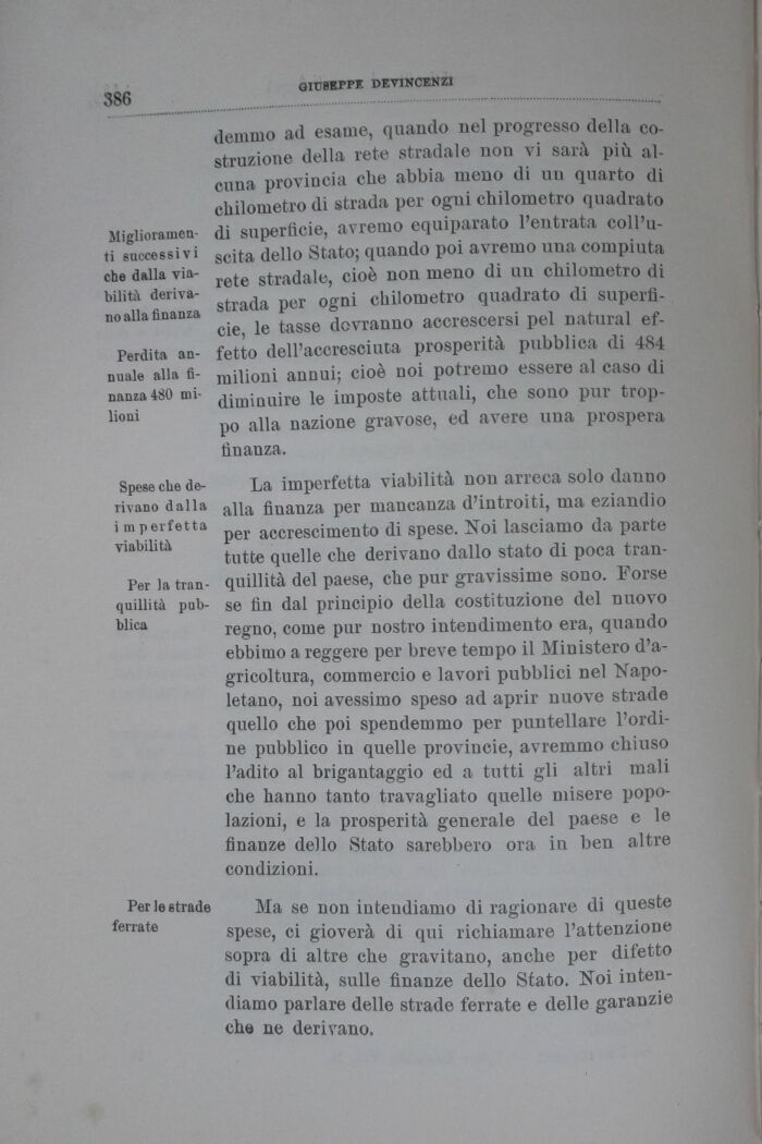 per accrescimento di spese. Noi lasciamo da parte tutte quelle che derivano dallo stato di poca tranquillità del paese, che pur gravissime sono. Forse se fin dal principio della costituzione del nuovo regno, come pur nostro intendimento era, quando ebbimo a reggere per breve tempo il Miuistero d'agricoltura, commercio e lavori pubblici nel Napoletano, noi avessimo speso ad aprir nuove strade quello che poi spendemmo per puntellare l'ordine pubblico in quelle provincie, avremmo chiuso l'adito al brigantaggio ed a tutti gli altri mali che hanno tanto travagliato quelle misere popolazioni, e la prosperità generale del paese e le finanze dello Stato sarebbero ora in ben altre condizioni.