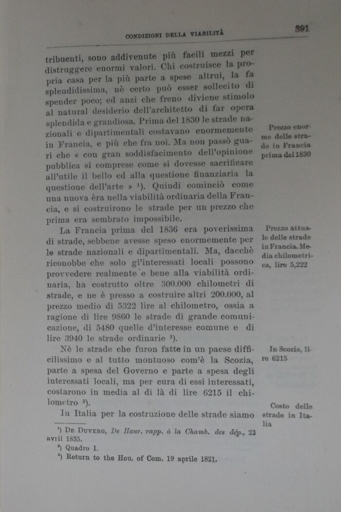La Francia prima del 1836 era poverissima di strade, sebbene avesse speso enormemente per le strade nazionali e dipartimentali. Ma, dacché riconobbe che solo gl'interessati locali possono provvedere realmente e bene alla viabilità ordinaria, ha costrutto oltre 300.000 chilometri di strade, e ne è presso a costruire altri 200.000, al prezzo medio di 5322 lire al chilometro, ossia a ragione di lire 9S60 le strade di grande comunicazione, di 5480 quelle d'interesse comune e di lire 3940 le strade ordinarie *).