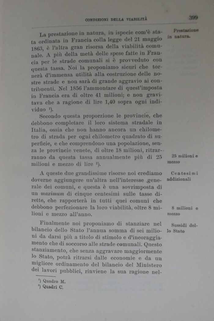A queste due grandissime risorse noi crediamo doverne aggiungere un'altra nell'interesse .generale dei comuni, e questa è una sovrimposta di un maximum di cinque centesimi sulle tasse dirette, che rapporterà in tutti quei comuni che debbono perfezionare la loro viabilità, oltre 8 milioni e mezzo all'auno.