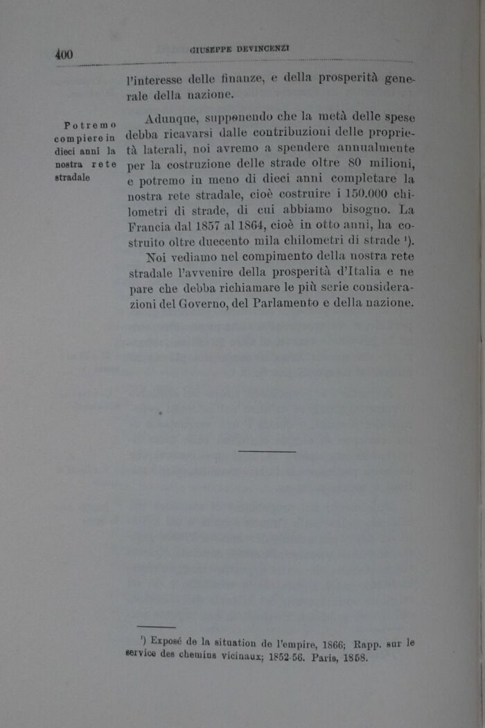 Potremo Adunque, supponendo che la metà delle spese compierò in debba ricavarsi dalle contribuzioni delle proprie-dieci anni la t;\ laterali, noi avremo a spendere annualmente nostra rete per ]a costruzione delle strade oltre 80 milioni, stradale e peremo iu meno di dieci anni completare la nostra rote stradale, cioè costruire i 150.000 chilometri di strade, di cui abbiamo bisogno. La Francia dal 1S57 al 1SG4, cioè in otto anni, ha costruito oltre duecento mila chilometri di strade ').