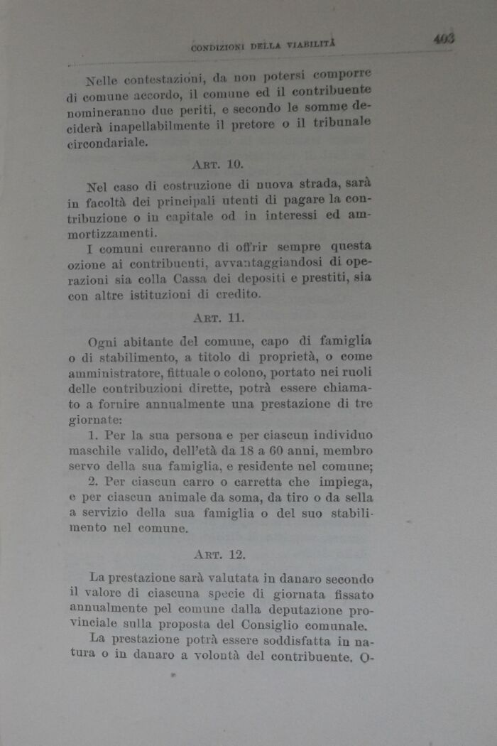 Ogni abitante del comuue, capo di famiglia o di stabilimento, a titolo di proprietą, o come amministratore, Attuale o colono, portato nei ruoli delle contribuzioni dirette, potrą essere chiamato a fornire annualmente una prestazione di tre giornate: