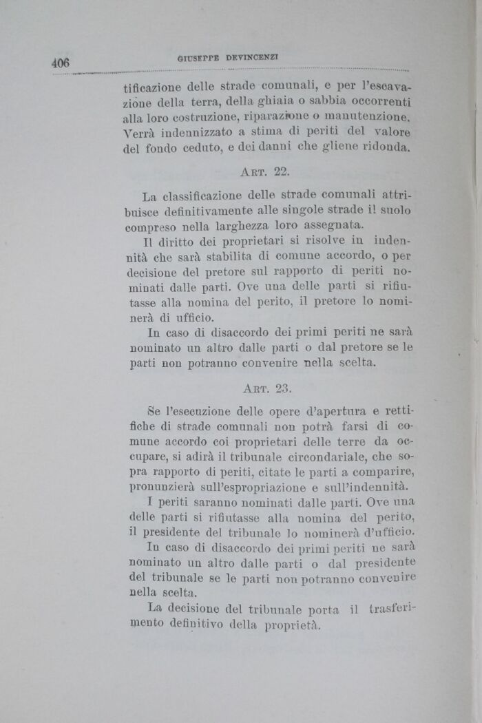 Se l'esecuzione delle opere d'apertura e rettifiche di strade comunali non potrą farsi di comune accordo coi proprietari delle terre da occupare, si adirą il tribunale circondariale, che sopra rapporto di periti, citate le parti a comparire, pronunzierą sull'espropriazione e sull'indennitą.