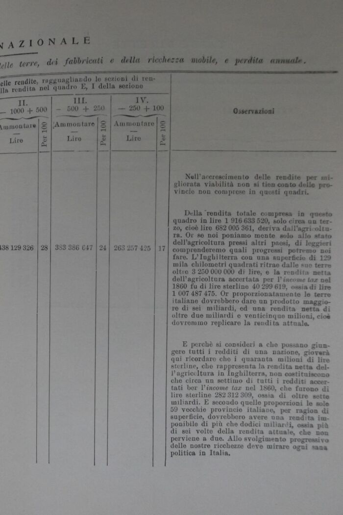 Della rendita totale compresa io questo quadro in lire 1 916 033 520, solo» rea uu terzo, cioè lire 682 005 361, deriva dall'agri oliera. Or ko noi poniamo mente solo aito *fafo dell'agricoltura pressi altri paoni, di legga i couii>ionderemo quali progressi potremo o«m fare. L1 Inghilterra cou una auperfìciu di 129 mila chilometri quadrati ritrae dulie ne terr»-oltio 3 250 000 000 di lire, e la reoifit.i oett.t dell'agricoltura accertata per V ineo»'« iax nel 1860 fu di lire sterline 40 299 619, «.«indi lire 1 007 487 475. Or proporzionatamente le terre italiano dovrebbero dare un prodotto maggioro di sei miliardi, ed una rendita netta di oltre due miliardi e venticinque milioni, cioè dovremmo replicare la reudita attuale.