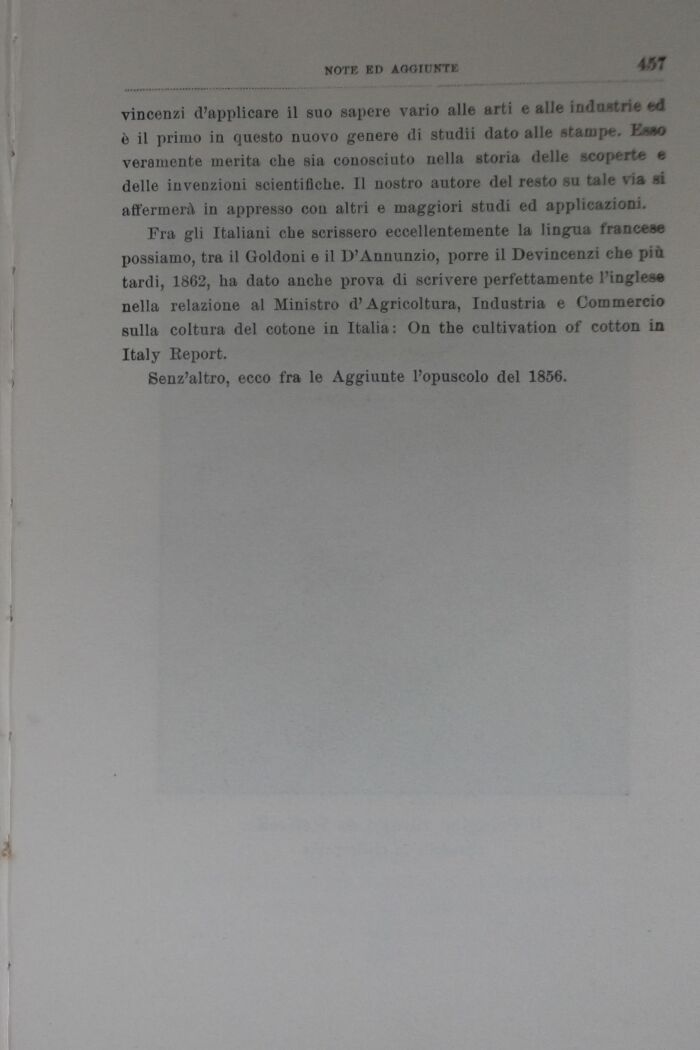 Fra gli Italiani che scrissero eccellentemente la lingua francese possiamo, tra il Goldoni e il D'Annunzio, porre il Devincenzi che più tardi, 1862, ha dato anche prova di scrivere perfettamente l'inglese nella relazione al Ministro d'Agricoltura, Industria e Commercio sulla coltura del cotone in Italia: On the cultivation of cotton in Italy Report.
