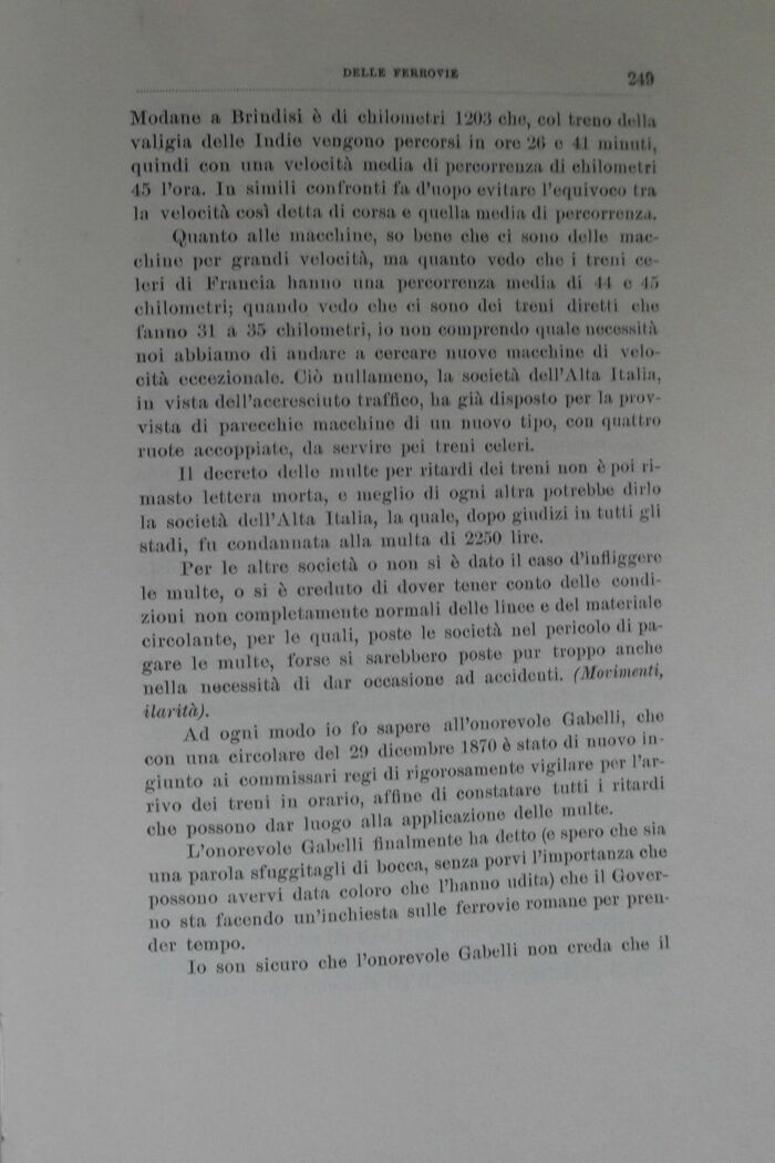 Modano a Brindici è di chilo,mari 1203 eh,s col treno drlh valigia delle Indio vengono percorsi ir, ore 20 e -Il , ,[,' quindi con una velocità media di percorrenza di chilo,,,,tri 45 Poro. In simili confronti fa d'uopo evitare Peqnivoro Ira In velocità così detta di corsa e quella media di percorrer,za Quanto alle macchine, ho bone che ci sono delle mar eh,no per grandi velocità, ma (pianto vedo dici treni Ieri di Francia hanno una percorrenza media di II e 45 chilometri; quando vedo ohe ri sono del treni diretti cho fanno 31 a 35 chilometri, io non comprendo quale necessità noi abbiamo di andare a cercare nuovo macchine di velocità eccezionale. (Jiò nullameno, la società dell'Alta Itali», in vista del l'accresciuto traffico, ha già disposto per la provvista di parecchio macchine di un nuovo tipo, con quattro ruote accoppiato, da servire pei treni celeri.