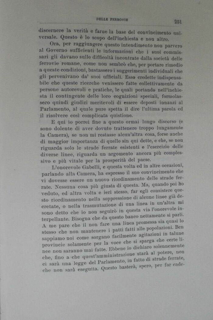 E qui io porrei line a questo ormai lungo discorso (e sono dolente di aver dovuto trattenere troppo lungamente la Camera), se non mi restasse alcun'altra cosa, forse anche di maggior importanza di quelle sin qui dette, e che, se non riguarda solo le strade ferrate esistenti e l'esercizio delle diverse linee, riguarda un argomento ancora più complessivo e più vitale per la prosperità del paese.