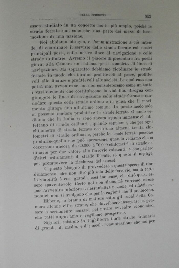 E questo bisogno di provvedere a questa specie di riordinamento, che non dirò più solo delle ferrovie, ma di tutte le viabilità è così grande, così immenso, che dirò quasi essere spaventevole. Certo noi non siamo nò vorremo essere per l'avvenire inferiore a nessun'altra nazione, ed i fatti economici non si svolgono che per le cagioni che li producono.