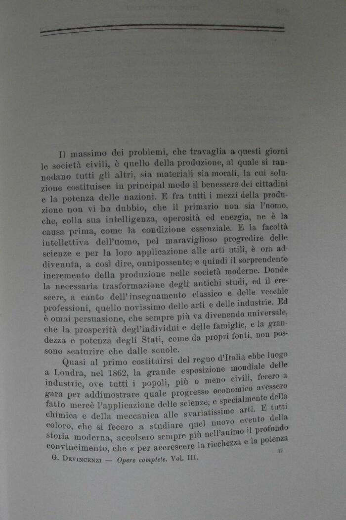 Il massimo dei problemi, che travaglia a questi giorni le società civili, è quello della produzione, al quale si rannodano tutti gli altri, sia materiali sia morali, la cui soluzione costituisce in principal modo il benessere dei cittadini e la potenza delle nazioni. E fra tutti i mezzi della produzione non vi ha dubbio, che il primario non sia l'uomo, che, colla sua intelligenza, operosità ed energia, ne è la causa prima, come la condizione essenziale. E la facoltà iutellettiva dell'uomo, pel maraviglioso progredire delle scienze e per la loro applicazione alle arti utili, è ora addivenuta, a così dire, onnipossente; e quindi il sorprendente incremento della produzione nelle società moderne. Donde la necessaria trasformazione degli antichi studi, ed il crescere, a canto dell'insegnamento classico e delle vecchie professioni, quello novissimo delle arti e delle industrie. Ed è ornai persuasione, che sempre più va divenendo universale, che la prosperità degl'individui e delle famiglie, e la grandezza e potenza degli Stati, come da propri fonti, non possono scaturire che dalle scuole.