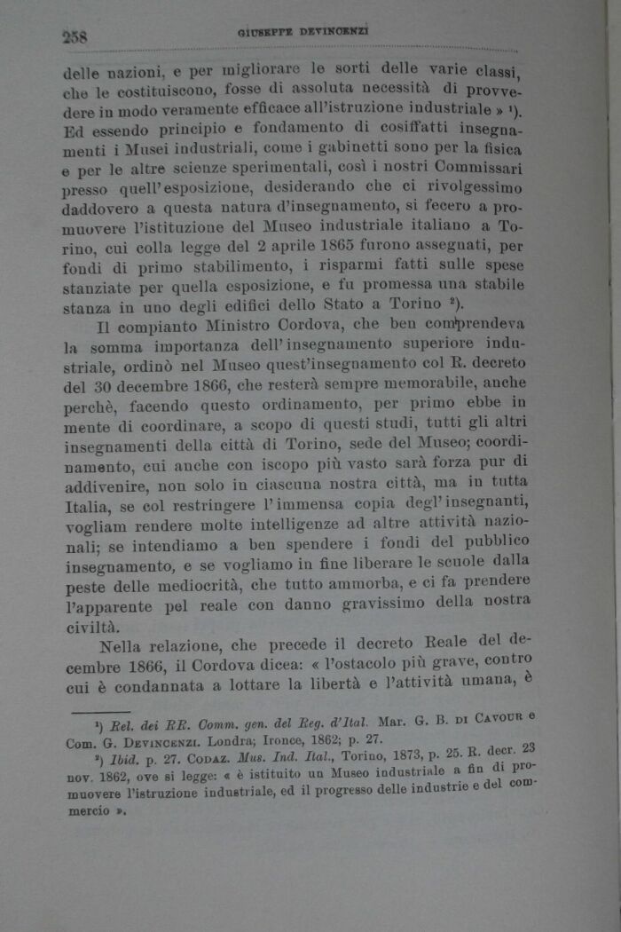 Il compianto Ministro Cordova, che ben comprendeva la somma importanza dell'insegnamento superiore industriale, ordinò nel Museo quest'insegnamento col E. decreto del 30 decembre 1866, che resterà sempre memorabile, anche perchè, facendo questo ordinamento, per primo ebbe in mente di coordinare, a scopo di questi studi, tutti gli altri insegnamenti della città di Torino, sede del Museo; coordinamento, cui anche con iscopo più vasto sarà forza pur di addivenire, non solo in ciascuna nostra città, ma iu tutta Italia, se col restringere l'immensa copia degl'insegnanti, vogliam rendere molte intelligenze ad altre attività nazionali; se intendiamo a ben spendere i fondi del pubblico insegnamento, e se vogliamo in fine liberare le scuole dalla peste delle mediocrità, che tutto ammorba, e ci fa prendere l'apparente pel reale con danno gravissimo della nostra civiltà.