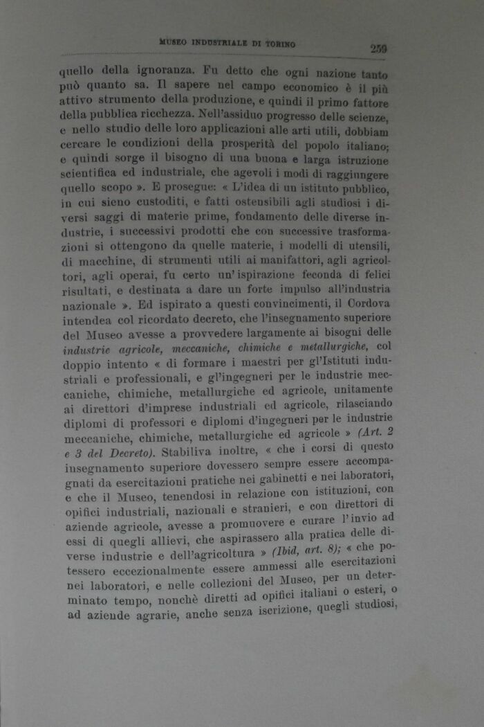 quello della ignoranza. Fu detto ehe ogni 0*2*01» tinto può quanto sa. Il sapere nel eampo economico è il ni* attivo strumento della produzione, e quindi il primo fattore della pubblica ricchezza. Nell'assiduo progresso delle scienze e nello studio delle loro applicazioni alle arti utili, dobbiam cercare le coudizioni della prosperità del popolo italiano-e quindi sorge il bisogno di una buona e larga istruzione scientifica ed industriale, che agevoli i modi di raggiungere quello scopo ». E prosegue: « L'idea di uu istituto pubblico in cui sieno custoditi, e fatti ostensibili agli studiosi i diversi saggi di materie prime, fondamento delle diverse industrie, i successivi prodotti che con successive trasformazioni si ottengono da quelle materie, i modelli di utensili, di macchine, di strumenti utili ai manifattori, agli agricoltori, agli operai, fu certo un'ispirazione feconda di felici risultati, e destinata a dare un forte impulso all'industria nazionale ». Ed ispirato a questi convincimenti, il Cordova intendea col ricordato decreto, che l'insegnamento superiore del Museo avesse a provvedere largamente ai bisogni delle industrie agricole, meccaniche, chimiche e metallurgiche, col doppio intento « di formare i maestri per gl'Istituti industriali e professionali, e gl'ingegneri per le industrie meccaniche, chimiche, metallurgiche ed agricole, unitamente ai direttori d'imprese industriali ed agricole, rilasciando diplomi di professori e diplomi d'ingegneri per le industrie meccaniche, chimiche, metallurgiche ed agricole » (Art. 2 e 3 del Decreto). Stabiliva inoltre, « che i corsi di questo insegnamento superiore dovessero sempre essere accompagnati da esercitazioni pratiche nei gabinetti e nei laboratori, e che il Museo, tenendosi in relazione con istituzioni, con opifìci industriali, nazionali e stranieri, e con direttori di aziende agricole, avesse a promuovere e curare l'invio ad essi di quegli allievi, che aspirassero alla pratica delle diverse industrie e dell'agricoltura » (lbid, art. 8); « che potessero eccezionalmente essere ammessi alle esercitazioni nei laboratori, e nelle collezioni del Museo, per un determinato tempo, nonché diretti ad opifici italiani o esteri, o ad aziende agrarie, anche senza iscrizione, quegli studiosi,