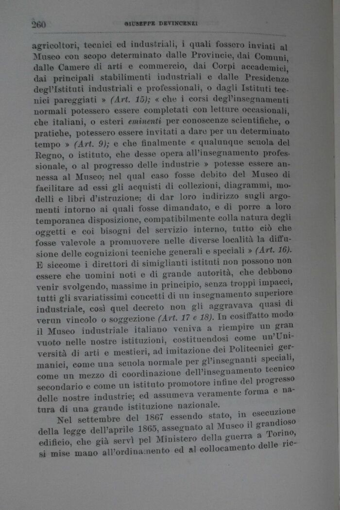 agricoltori, tecnici ed industriali, i quali fossero inviati al Museo con scopo determinato dalle Provincie, dai Comi dalle Camere di arti e commercio, dai Corpi accademici' dai principali stabilimenti industriali e dalle Presidenze degl'Istituti industriali e professionali, o dagli Istituti tecnici pareggiati » (Art. 15); « clie i corsi degl'insegnamenti normali potessero essere completati con letture occasionali che italiani, o esteri eminenti per conoscenze scientifiche o pratiche, potessero essere invitati a dare per un determinato tempo » (Art. 9); e che finalmente « qualunque scuola del Kegno, o istituto, che desse opera all'insegnamento professionale, o al progresso delle industrie » potesse essere annessa al Museo; nel qual caso fosse debito del Museo di facilitare ad essi gli acquisti di collezioni, diagrammi, modelli e libri d'istruzione; di dar loro indirizzo sugli argomenti intorno ai quali fosse dimandato, e di porre a loro temporanea disposizione, compatibilmente colla natura degli oggetti e coi bisogni del servizio interno, tutto ciò che fosse valevole a promuovere nelle diverse località la diffusione delle cognizioni tecniche generali e speciali » (Art. 16). E siccome i direttori di simiglianti istituti non possono non essere che uomini noti e di grande autorità, che debbono venir svolgendo, massimo in principio, senza troppi impacci, tutti gli svariatissimi concetti di un insegnamento superiore industriale, così quel decreto non gli aggravava quasi di verun vincolo o soggezione (Art. 17 e 18). In cosiffatto modo il Museo industriale italiauo veniva a riempire un gran vuoto nelle nostre istituzioni, costituendosi come un'Università di arti e mestieri, ad imitazione dei Politecnici germanici, come una scuola normale per gl'insegnanti speciali, come un mezzo di coordinazione dell'insegnamento tecnico secondario e come un istituto promotore infine del progresso delle nostre industrie; ed assumeva veramente forma e natura di una grande istituzione nazionale.
