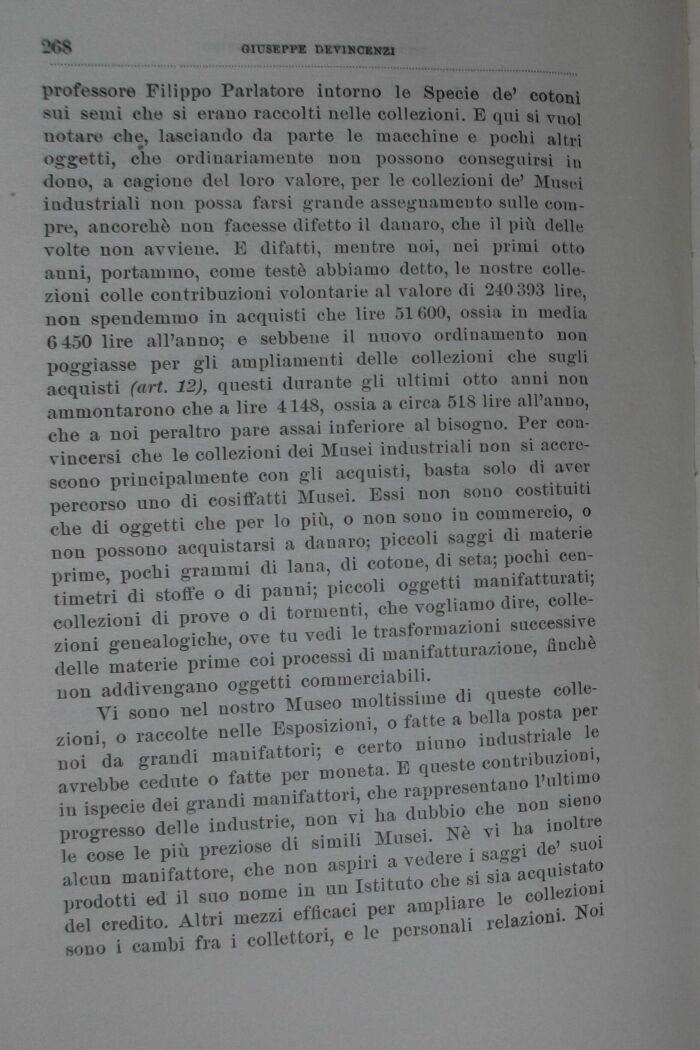 professore Filippo Parlatore intorno le Speeie de' sui semi che si erano raccolti nelle collezioni E qui notare che, lasciando da parte le macchine e S ! oggetti, che ordinariamente non possono conse<Ìi dono, a cagione del loro valore, per le collezioni de' Muse industriali non possa farsi grande assegnamento sulle coro pre, ancorché non facesse difetto il danaro, che il più delle volte non avviene. E difatti, mentre noi, nei primi otto anni, portammo, come testò abbiamo detto, le nostre collezioni colle contribuzioni volontarie al valore di 240 393 lire non spendemmo in acquisti che lire 51600, ossia in media 6 450 lire all'anno; e sebbene il nuovo ordinamento non poggiasse per gli ampliamenti delle collezioni che sugli acquisti (art. 12), questi durante gli ultimi otto anni non ammontarono che a lire 4148, ossia a circa 518 lire all'anno, che a noi peraltro pare assai inferiore al bisogno. Per convincersi che le collezioni dei Musei industriali non si accrescono principalmente con gli acquisti, basta solo di aver percorso uno di cosiffatti Musei. Essi non sono costituiti che di oggetti che per lo più, o non sono in commercio, o non possono acquistarsi a danaro; piccoli saggi di materie prime, pochi grammi di lana, di cotone, di seta; pochi centimetri di stoffe o di panni; piccoli oggetti manifatturati; collezioni eli prove o di tormenti, che vogliamo dire, collezioni genealogiche, ove tu vedi le trasformazioni successive delle materie prime coi processi di manifattura/ione, nuche non addivengano oggetti commerciabili.