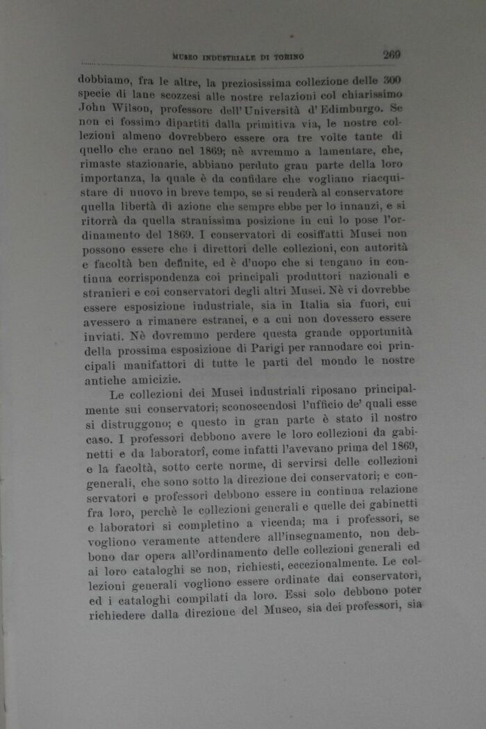 \ obbla,n°, fra le altre, la preziosissima collezione delle ?**) specie di Urne scozzesi alle nostre relazioni col chiarissimo ?Jonn Wilson, professore dell'Universitā d'Edimburgo. Se non ci tossimo dipartiti dalla primitiva via, le nostre collezioni almeno dovrebbero essere ora tre volte tante di quello che erano nel 1869; nč avremmo a lamentare, che, rimaste stazionarie, abbiano perduto gran parte della loro importanza, la quale č da confidare che vogliano riacquistare di nuovo in breve tempo, se si renderā al conservatore quella libertā di azione che sempre ebbe per lo innauzi, e si ritorrā da quella stranissima posizione in cui lo pose l'ordinamento del 1869. I conservatori di cosiffatti Musei non possono essere che i direttori delle collezioni, con autoritā e facoltā ben definite, ed č d'uopo che si tengano in continua corrispondenza coi principali produttori nazionali e stranieri e coi conservatori degli altri Musei. Nč vi dovrebbe essere esposizione industriale, sia in Italia sia fuori, cui avessero a rimanere estranei, e a cui non dovessero essere inviati. Nč dovremmo perdere questa grande opportunitā della prossima esposizione di Parigi per rannodare coi principali manifattori di tutte le parti del mondo le nostre antiche amicizie.