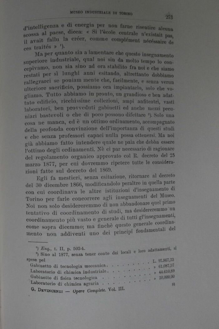 Ma per quanto sia a lamentare che questo insegnamento superiore industriale, qual noi sin da molto tempo lo con cepivamo, non sia sino ad ora stabilito fra noi e che siamo restati per sì lunghi anni esitando, altrettanto dobbiamo rallegrarci se pouiam mente che, facilmente, e senza venni ulteriore sacrificio, possiamo ora impiantarlo, solo che vogliamo. Tutto abbiamo in pronto, un grandioso e ben adattato edificio, ricchissime collezioni, ampi anfiteatri, vasti laboratori, ben provveduti gabinetti ed anche mezzi pecuniari baste voli o che di poco possouo difettare 2). Solo una cosa ne manca, ed è un ottimo ordinamento, accompagnato della profonda convinzione dell'importanza di questi studi e che senza professori capaci nulla possa ottenersi. Ma noi già abbiamo fatto intendere quale ne paia che debba essere l'ottimo degli ordinamenti. Nè ci par necessario di ragionare del regolamento organico approvato col K. decreto del 25 marzo 1877, per cui dovremmo ripetere tutte le considerazioni fatte sul decreto del 1860.