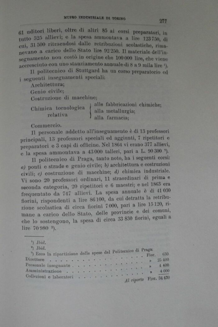 Il politecnico di Praga, tanto noto, ha i seguenti corsi: a) ponti e strade e genio civile; 1)) architettura e costruzioni civili; c) costruzione di macchine; d) chimica industriale. Vi sono 20 professori ordinari, 11 straordinari di prima e seconda categoria, 20 ripetitori e 6 maestri; e nel 1803 era frequentato da 747 allievi. La spesa annuale è di 41030 fiorini, rispondenti a lire 8G100, da cui detratta la retribuzione scolastica di circa fiorini 7 000, pari a lire 15120, riinane a carico dello Stato, delle provincie e dei comuni, che lo sostengono, la spesa di circa 33 830 fiorini, eguali a lire 70980 3).