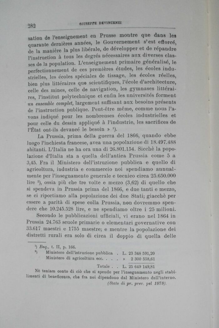 La Prussia, prima della guerra del 1866, quando ebbe luogo l'inchiesta fraucese, avea una popolazione di 18.497.488 abitanti. L'Italia ne ha ora una di 26.801.154. Sicché la popolazione d'Italia sta a quella dell'antiea Prussia come 5 a 3,45. Fra il Ministero dell'istruzione pubblica e quello di agricoltura, industria e commercio noi spendiamo annualmente per l'insegnamento generale e tecnico circa 25.650.000 lire 2), ossia più che tre volte e mezzo (3,62) di quello che si spendeva in Prussia prima del 1866, e due tanti e mezzo, se ci riportiamo alla popolazione dei due Stati; giacché per essere a parità di spese colla Prussia, non dovremmo spendere che 10.245.528 lire, e ne spendiamo oltre i 25 milioni.