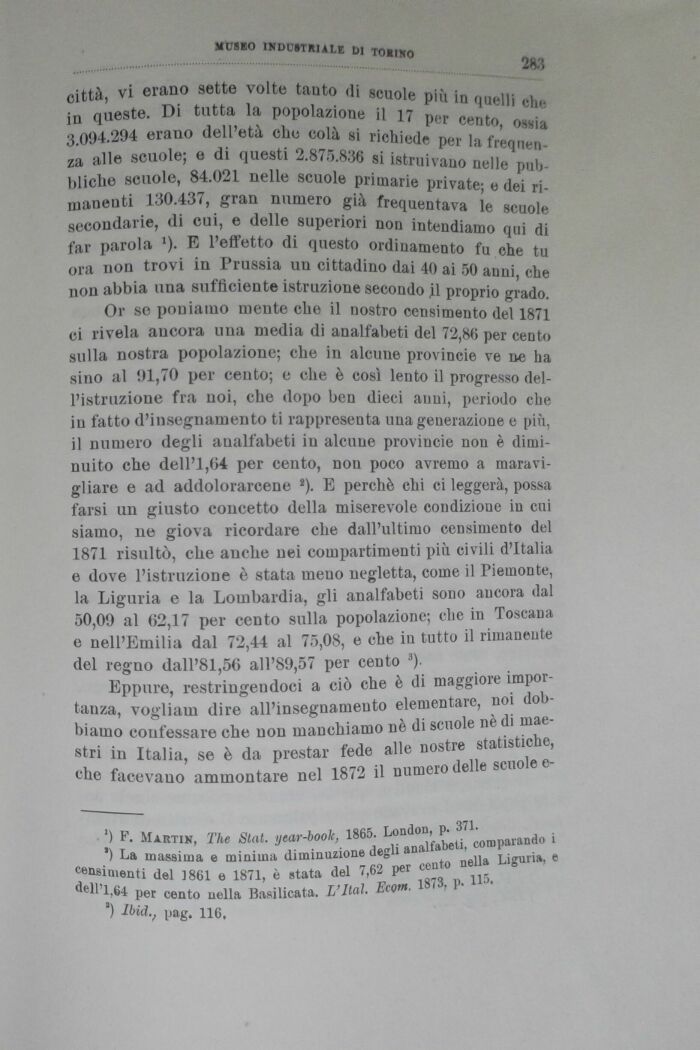 Or se poniamo mente che il nostro censimento deì 1871 ci rivela ancora una media di analfabeti del 72,86 per cento sulla nostra popolazione; che in alcune provincie ve ne ha sino al 91,70 per cento; e che è così lento il progresso dell'istruzione fra noi, che dopo ben dieci anni, periodo che iu fatto d'insegnamento ti rappresenta una generazione e più, il numero degli analfabeti in alcune provincie non è diminuito che dell'I,04 per cento, non poco avremo a maravigliare e ad addolorarcene 2). E perchè chi ci leggerà, possa farsi un giusto concetto della miserevole condizione in cui siamo, ne giova ricordare che dall'ultimo censimento del 1871 risultò, che anche nei compartimenti più civili d'Italia e dove l'istruzione è stata meno negletta, come il Piemonte, la Liguria e la Lombardia, gli analfabeti sono ancora dal 50,09 al 62,17 per cento sulla popolazione; che in Toscana e nell'Emilia dal 72,44 al 75,08, e che in tutto il rimanente del regno dall'81,56 all'89,57 per cento 3).