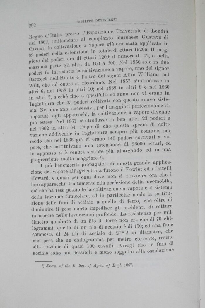 Regno d'Italia presso l'Esposizione Universale di Londra 11 e 1° 1862, unitamente al compianto marchese Gustavo di Cavour, la coltivazioue a vapore già era stata applicata in 89 poderi della estensione iu totale di ettari 19206. Il mag. giore dei poderi era di ettari 1200; il minore di 42, e nella massima parte gli altri da 100 a 300. Nel 185G solo in due poderi fu introdotta la coltivazioue a vapore, uno del signor Battrock nell'Hunts e l'altro del signor Allin Williams nel Wilt, clie ad onore si ricordano. Nel 1857 s'introdusse in altri 6; nel 1858 in altri 10; nel 1859 in altri 8 e nel 1860 in altri 7; sicché fino a quest'ultimo anno non vi erano in Inghilterra che 33 poderi coltivati con questo nuovo sistema. Nei due anni successivi, per i maggiori perfezionamenti apportati agli apparecchi, la coltivazione a vapore divenne più estesa. Nel 1861 s'introdusse in ben altri 23 poderi e nel 1862 in altri 34. Dopo di che questa specie di coltivazione addivenne in Inghilterra sempre più comune, per modo che nel 1866 già vi erano 140 poderi coltivati a vapore, che costituivano una estensione di 26000 ettari, ed in appresso si è venuta sempre più allargando ed in una progressione molto maggiore