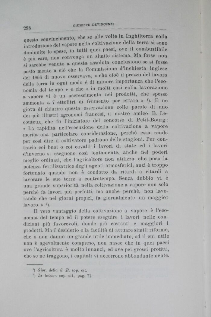 questo convincimento, che se alle volte in Inghilterra colla introduzione del vapore nella coltivazione della terra si sono dimiuuite le spese, in tutti quei paesi, ove il combustibile è più caro, non convenga un simile sistema. Ma forse non si sarebbe venuto a questa assoluta conclusione se si fosse posto mente a ciò che la Commissione d'iuchiesta inglese del 1866 di nuovo osservava, « che cioè il prezzo del lavoro della terra in ogni modo ò di minore importanza che l'eco-nomia del tempo » e che « in molti casi colla lavorazione a vapore vi ò un accrescimento nei prodotti, che spesso ammonta a 7 ettolitri di frumento per ettaro » '). E ne giova di chiarire questa osservazione colle parole di uno dei più illustri agronomi fraucesi, il nostro amico E. Le-couteux, che fu l'iniziatore del concorso di Petit-Bourg: « La rapidità nell'esecuzione della coltivazione a vapore merita una particolare considerazione, perchè essa rende per così dire il coltivatore padrone delle stagioni. Per contrario coi buoi o coi cavalli i lavori di state ed i lavori d'iuverno si eseguono così lentamente, anche nei poderi meglio ordinati, che l'agricoltore non utilizza che poco la potenza fertilizzatrice degli agenti atmosferici; anzi è troppo fortunato quando non è condotto da ritardi a ritardi a lavorare le sue terre a controtempo. Senza dubbio vi è una grande supsriorità nella coltivazione a vapore non solo perchè fa lavori più perfetti, ma anche perchè, non lavorando che nei giorni propizi, fa giornalmente un maggior lavoro » 2).