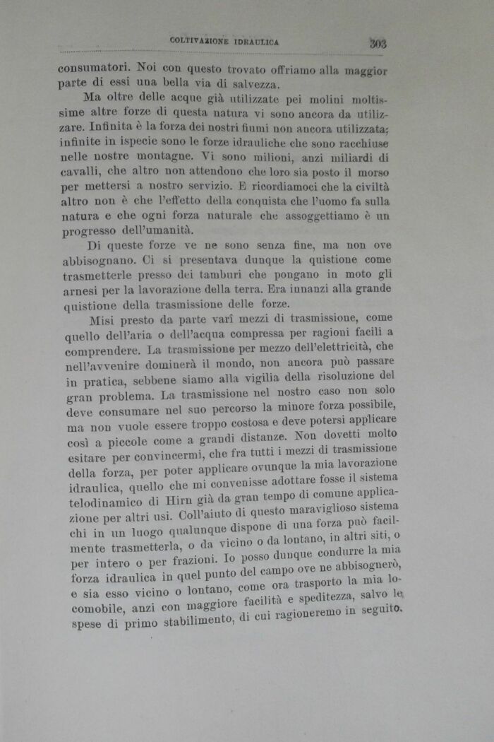 Misi presto da parte vari mezzi di trasmissioue, come quello dell'aria o dell'acqua compressa per ragioni facili a comprendere. La trasmissione per mezzo dell'elettricità, che nell'avvenire dominerà il mondo, non ancora può passare in pratica, sebbene siamo alla vigilia della risoluzione del gran problema. La trasmissione nel nostro caso non solo deve consumare nel suo percorso la minore forza possibile, ma non vuole essere troppo costosa e deve potersi applicare così a piccole come a grandi distanze. Non dovetti molto esitare per convincermi, che fra tutti i mezzi di trasmissione della forza, per poter applicare ovunque la mia lavorazione idraulica, quello che mi convenisse adottare fosse il sistema telodinamico di Hirn già da gran tempo di comune applicazione per altri usi. Coll'aiuto di questo maraviglio sistema chi in un luogo qualunque dispone di una forza può facilmente trasmetterla, o da vicino o da lontano, in altri siti, o per intero o per frazioni. Io posso dunque condurre la mia forza idraulica in quel punto del campo ove ne abbisognerò, e sia esso vicino o lontano, come ora trasporto la mia locomobile, anzi con maggiore facilità e speditezza, salvo le spese di primo stabilimento, di cui ragioneremo in seguito.