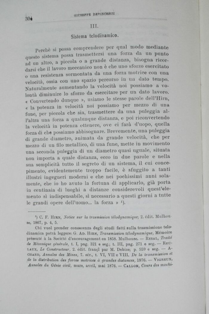Chi vuol prender conoscenza degli studi fatti sulla trasmissione telo-dinamica potrà leggere: G. Ad. Hirn, Transmission télodynamique, Mémoire prèseuté à la Société d'encouragement en 1858. Mulhouse. Resal, Traité de Mécanique yénérale, t. I, pag. 321 e seg.; t. Ili, pag. 271 e seg. Reo-laux, Le Constructeur} 2. édit. franai par M. Debize; p. 559 e seg. A-chard, Annales dea Mines, 7. sér., t. VI, VII e Vili. De la transmission et de la distribuiion des forces motrices à grandes distances, 1876. Vigreux, Annales du Génie civil, mars, avril, mai 1876. Callon, Cours des machi-