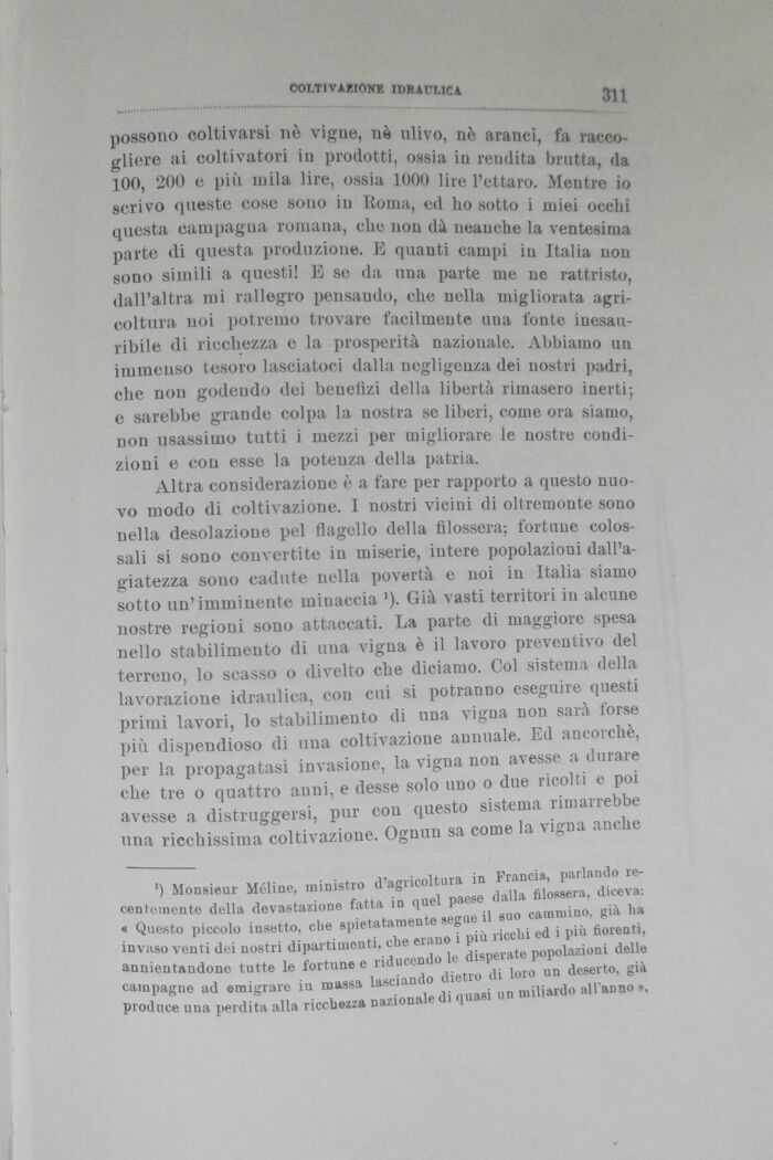 Altra considerazione è a fare per rapporto a questo nuovo modo di coltivazione. I nostri vicini di oltremonte sono nella desolazione pel flagello della filossera; fortune colossali si sono convertite in miserie, intere popolazioni dall'agiatezza sono cadute nella povertà e noi in Italia siamo sotto un'imminente minaccia '). Già vasti territori in alcune nostre regioni sono attaccati. La parte di maggiore spesa nello stabilimento di una vigna è il lavoro preventivo del terreno, lo scasso o divelto che diciamo. Col sistema della lavorazione idraulica, con cui si potranno eseguire questi primi lavori, lo stabilimento di una vigna non sarà forse più dispendioso di una coltivazione annuale. Ed ancorché, per la propagatasi invasione, la vigna non avesse a durare che tre o quattro anni, e desse solo uno o due ricolti e poi avesse a distruggersi, pur con questo sistema rimarrebbe una ricchissima coltivazione. Ognun sa come la vigna anche