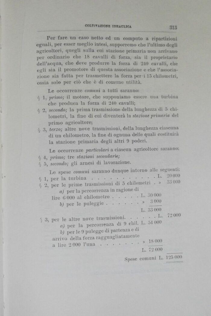 Per fare un caso netto ed un computo a ripartizioni eguali, per esser meglio intesi, supporremo che l'ultimo degli agricoltori, quegli sulla cui stazione primaria non arrivano per ordinario che 18 cavalli di forza, sia il proprietario dell'acqua, che deve produrre la forza di 210 cavalli, che egli sia il promotore di questa associazione e che l'associazione sia fatta per trasmettere la forza per i 15 chilometri, ossia solo per ciò che è di comune utilità.