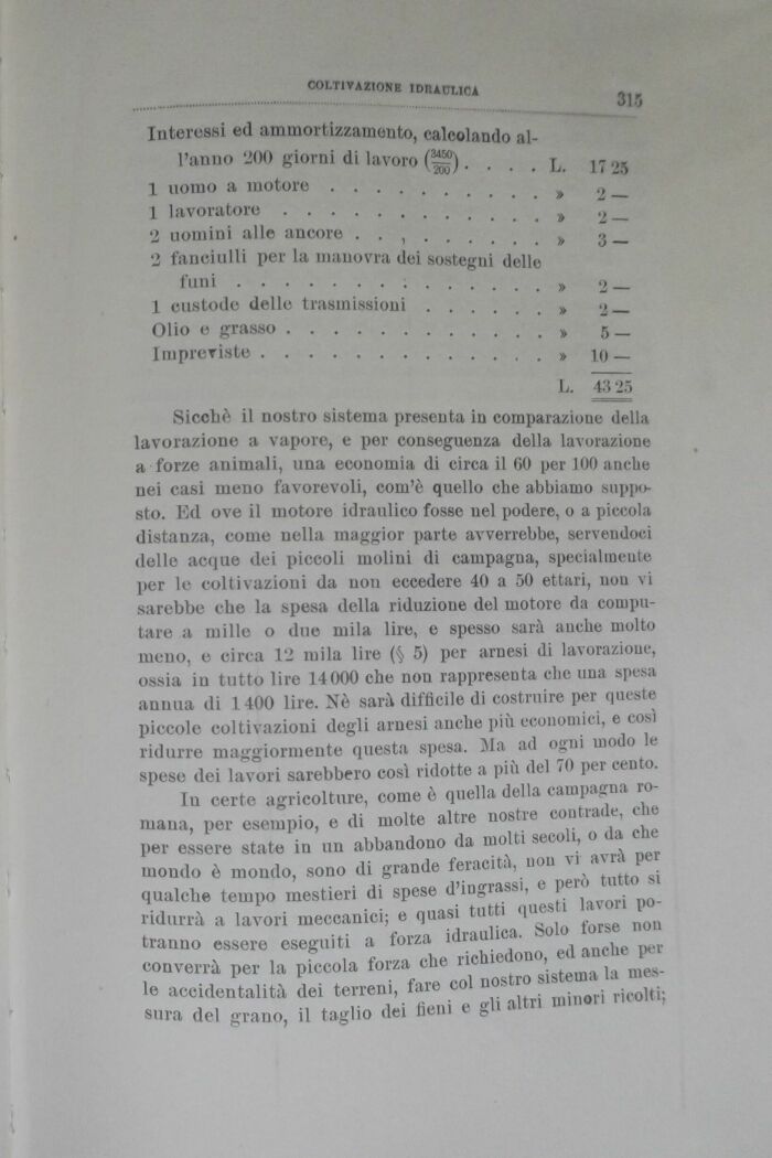 Sicché il nostro sistema presenta in comparazione della lavorazione a vapore, e per conseguenza della lavorazione a forze animali, una economia di circa il 60 per 100 anche nei casi meno favorevoli, com'è quello che abbiamo supposto. Ed ove il motore idraulico fosse nel podere, o a piccola distanza, come nella maggior parte avverrebbe, servendoci delle acque dei piccoli molini di campagna, specialmente per le coltivazioni da non eccedere 40 a 50 ettari, non vi sarebbe che la spesa della riduzione del motore da computare a mille o due mila lire, e spesso sarà anche molto meno, e circa 12 mila lire (§ 5) per arnesi di lavorazione, ossia in tutto lire 14000 che non rappresenta che una spesa annua di 1400 lire. Nè sarà difficile di costruire per queste piccole coltivazioni degli arnesi anche più economici, e così ridurre maggiormente questa spesa. Ma ad ogni modo le spese dei lavori sarebbero così ridotte a più del 70 per cento.