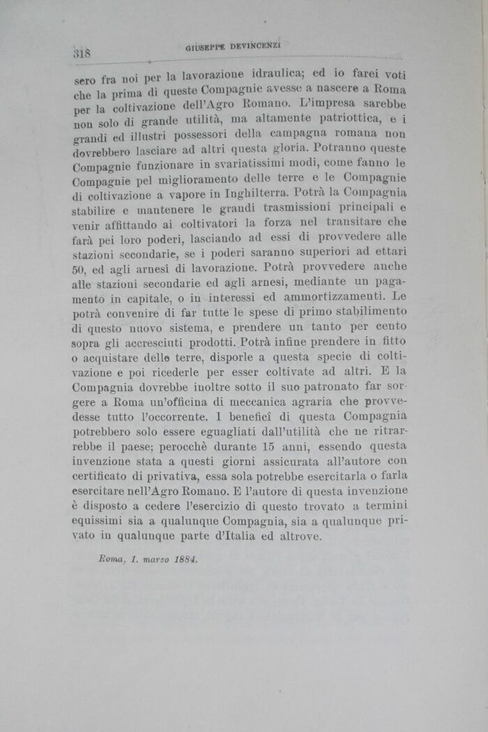 scro fra noi per la lavorazione idraulica; ed io farei voti che la prima di queste Compagnie avesse a nascere a Roma per la coltivazione dell'Agro Romano. L'impresa sarebbe uon solo di grande utilità, ma altamente patriottica, e i o-randi ed illustri possessori della campagna romana non dovrebbero lasciare ad altri questa gloria. Potranno queste Compagnie funzionare in svariatissimi modi, come fanno le Compagnie pel miglioramento delle terre e le Compagnie di coltivazioue a vapore in Inghilterra. Potrà la Compagnia stabilire e mantenere le grandi trasmissioni principali e venir affittando ai coltivatori la forza nel transitare che farà pei loro poderi, lasciando ad essi di provvedere alle stazioni secondarie, se i poderi saranuo superiori ad ettari 50, ed agli arnesi di lavorazione. Potrà provvedere anche alle stazioni secondarie ed agli arnesi, mediante un pagamento in capitale, o in interessi ed ammortizzamenti. Le potrà convenire di far tutte le spese di primo stabilimento di questo nuovo sistema, e prendere un tanto per cento sopra gli accresciuti prodotti. Potrà infine prendere in fitto o acquistare delle terre, disporle a questa specie di coltivazione e poi ricederle per esser coltivate ad altri. E la Compagnia dovrebbe inoltre sotto il suo patronato far sor gere a Roma un'officina di meccanica agraria che provvedesse tutto l'occorrente. I benefici di questa Compagnia potrebbero solo essere eguagliati dall'utilità che ne ritrarrebbe il paese; perocché durante 15 anni, essendo questa invenzione stata a questi giorni assicurata all'autore con certificato di privativa, essa sola potrebbe esercitarla o farla esercitare nell'Agro Romano. E l'autore di questa invenzione è disposto a cedere l'esercizio di questo trovato a termini equissimi sia a qualunque Compagnia, sia a qualunque privato in qualunque parte d'Italia ed altrove.