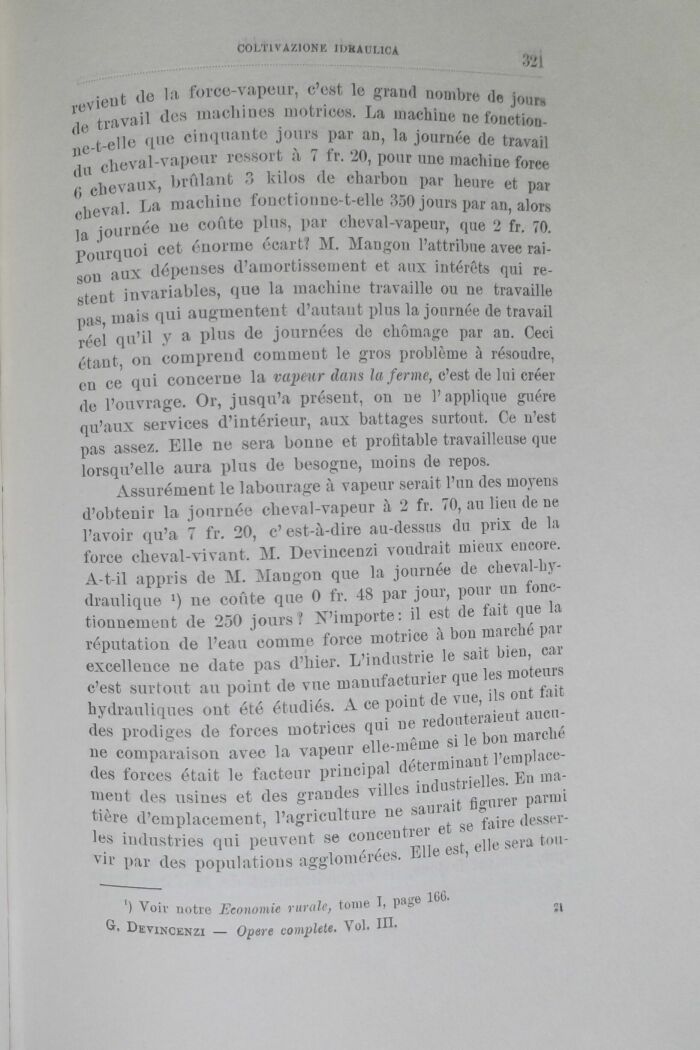 Assurément le labourage à vapeur serait l'un des moyens d'obtenir la journée clieval-vapeur à 2 fr. 70, au lieu de ne l'avoir qu'a 7 fr. 20, e' est-à-dire au-dessus du prix de la force cheval-vivant. M. Devincenzi voudrait mieux encore. A-t-il appris de M. Mangon que la journée de clieval-hy-draulique l) ne conte que 0 fr. 48 par jour, pour un fonc-tionnement de 250 jours? N'importe: il est de fait que la réputation (le Feau comme force motrice à bon marche par excelleuce ne date pas d'hier. L'industrie le sait bien, car c'est surtout au point (le vue manufacturier que les moteurs hydrauliques ont été étudiés. A ce point de vue, ils ont fait des prodiges de forces motrices qui ne redouteraieut aneline comparaison avec la vapeur elle-meme si le bon marche des forces était le facteur principal determinai l'emplace-ment des usines et des grandes villcs industrielles. En manière d'emplacement, l'agriculture ne sauraifc fignrer panni iudustries qui peuveut se concentrer et se faire ciessei-l>ar des populations agglomérées. Elle est, elle sera ro