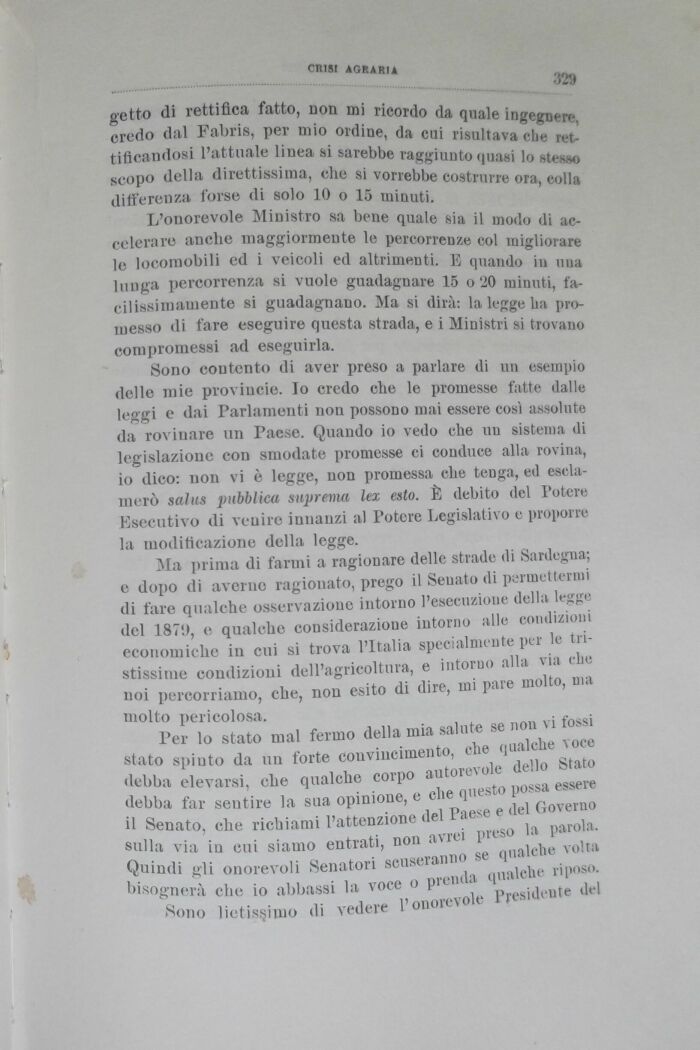 Ma prima di farmi a ragionare delle strade di Sardegna; e dopo di averne ragionato, prego il Senato di permettermi di fare qualche osservazione intorno l'esecuzione della legge del 1871), e qualche considerazione intorno alle condizioni economiche in cui si trova l'Italia specialmente per le tristissime condizioni dell'agricoltura, e intorno alla via che noi percorriamo, che, non esito di dire, mi pare molto, ma molto pericolosa.