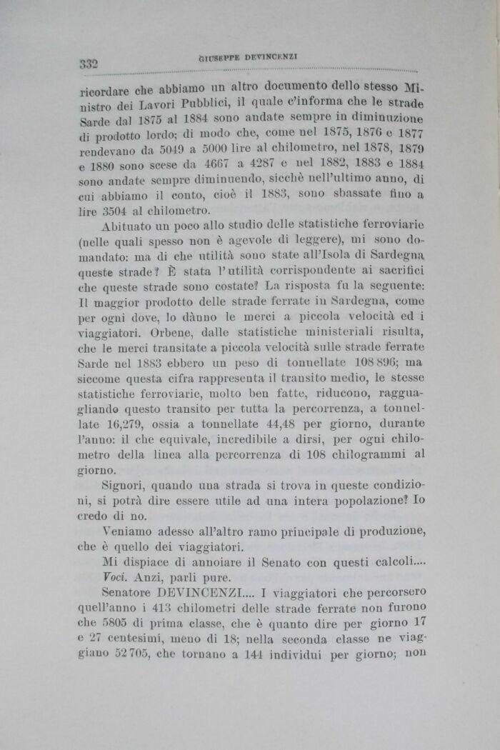 Senatore DEVINCENZI.... I viaggiatori che percorsero quell'anno i 413 chilometri delle strade ferrate non furono che 5805 di prima classe, che è quanto dire per giorno 17 e 27 centesimi, meno di 18; nella seconda classe ne viaggiano 52 705, che tornano a 144 individui per giorno; non
