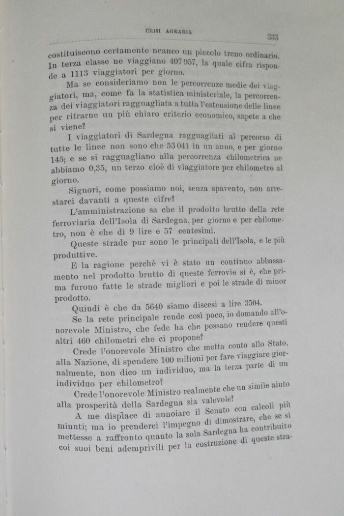 L'amministrazione sa che il prodotto brutto della rete ferroviaria dell'Isola di Sardegna, per giorno e per chilometro, non è che di 9 lire e 57 centesimi.