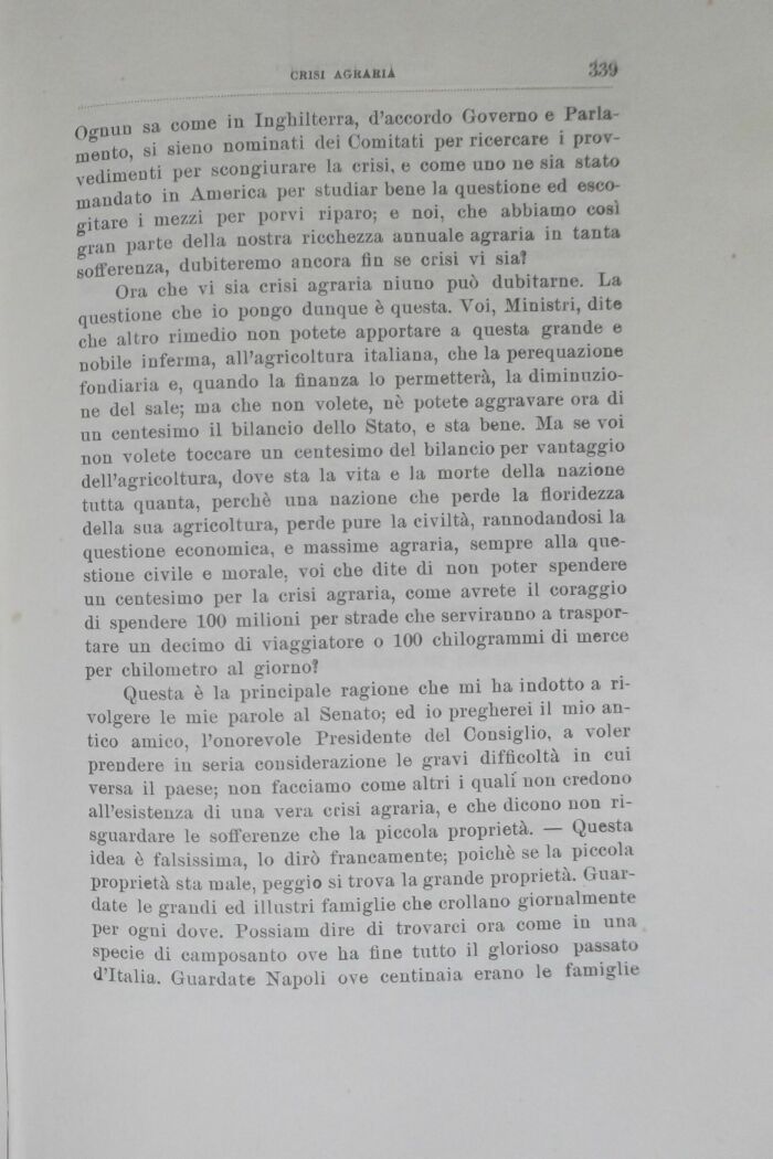 Ora che vi sia crisi agraria niuno può dubitarne. La questione che io pongo dunque è questa. Voi, Ministri, dite che altro rimedio non potete apportare a questa grande e nobile inferma, all'agricoltura italiana, che la perequazione fondiaria e, quando la finanza lo permetterà, la diminuzione del sale; ma che non volete, nè potete aggravare ora di un centesimo il bilancio dello Stato, e sta bene. Ma se voi non volete toccare un centesimo del bilancio per vantaggio dell'agricoltura, dove sta la vita e la morte della nazione tutta quanta, perchè una nazione che perde la floridezza della sua agricoltura, perde pure la civiltà, rannodandosi la questione economica, e massime agraria, sempre alla questione civile e morale, voi che dite di non poter spendere un centesimo per la crisi agraria, come avrete il coraggio di spendere 100 milioni per strade che serviranno a trasportare un decimo di viaggiatore o 100 chilogrammi di merce per chilometro al giorno?