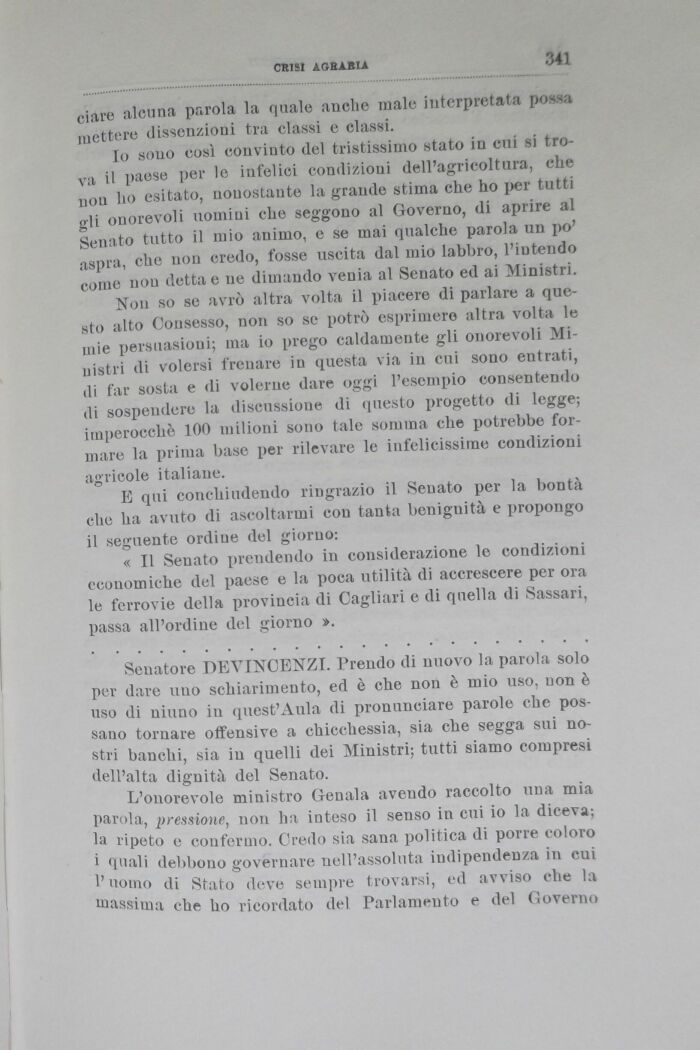 « Il Senato prendendo in considerazione le condizioni economiche del paese e la poca utilità di accrescere per ora le ferrovie della provincia di Cagliari e di quella di Sassari, passa all'ordine del giorno ».