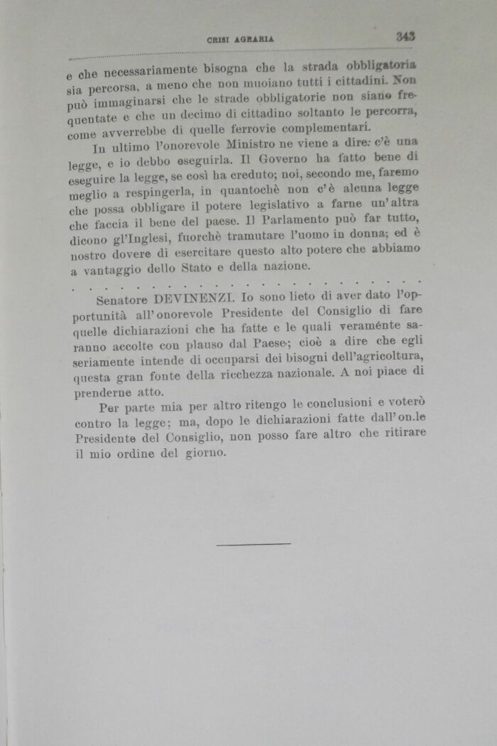 Senatore DEVESTENZI. Io sono lieto di aver dato l'opportunità all'onorevole Presidente del Consiglio di fare quelle dichiarazioni che ha fatte e le quali veraménte saranno accolte con plauso dal Paese; cioè a dire che egli seriamente intende di occuparsi dei bisogni dell'agricoltura, questa gran fonte della ricchezza nazionale. A noi piace di prenderne atto.