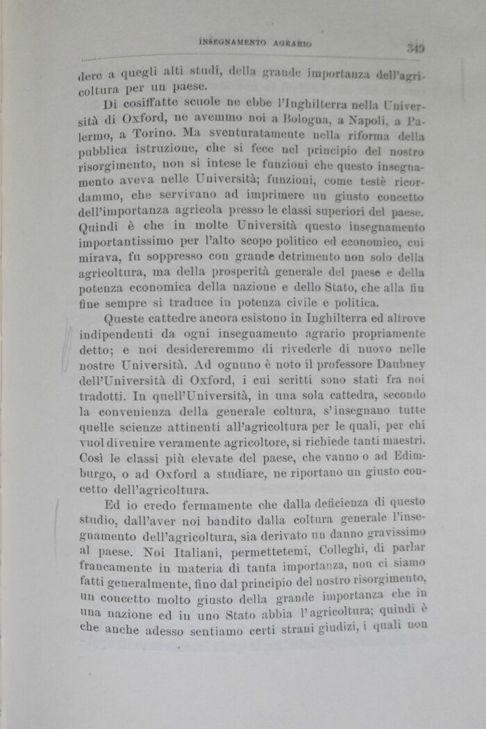 Di cosiffatte scuole ne ebbe l'Inghilterra nella Università di Oxford, ne avemmo noi a Bologna, a Napoli, a Palermo, a Torino. Ma sventuratamente nella riforma della pubblica istruzione, che si fece nel principio del nostro risorgimento, non si intese le funzioui che questo insegnamento aveva nelle Università; funzioui, come teste ricordammo, che servivano ad imprimere un giusto concetto dell'importanza agricola pi-esso le classi superiori del paese. Quindi è che in molte Università questo insegnamento importantissimo per l'alto scopo politico ed economico, cui mirava, fu soppresso con grande detrimento non solo della agricoltura, ma della prosperità generale del paese e della potenza economica della nazione e dello Stato, che alla fin fine sempre si traduce in potenza civile e politica.