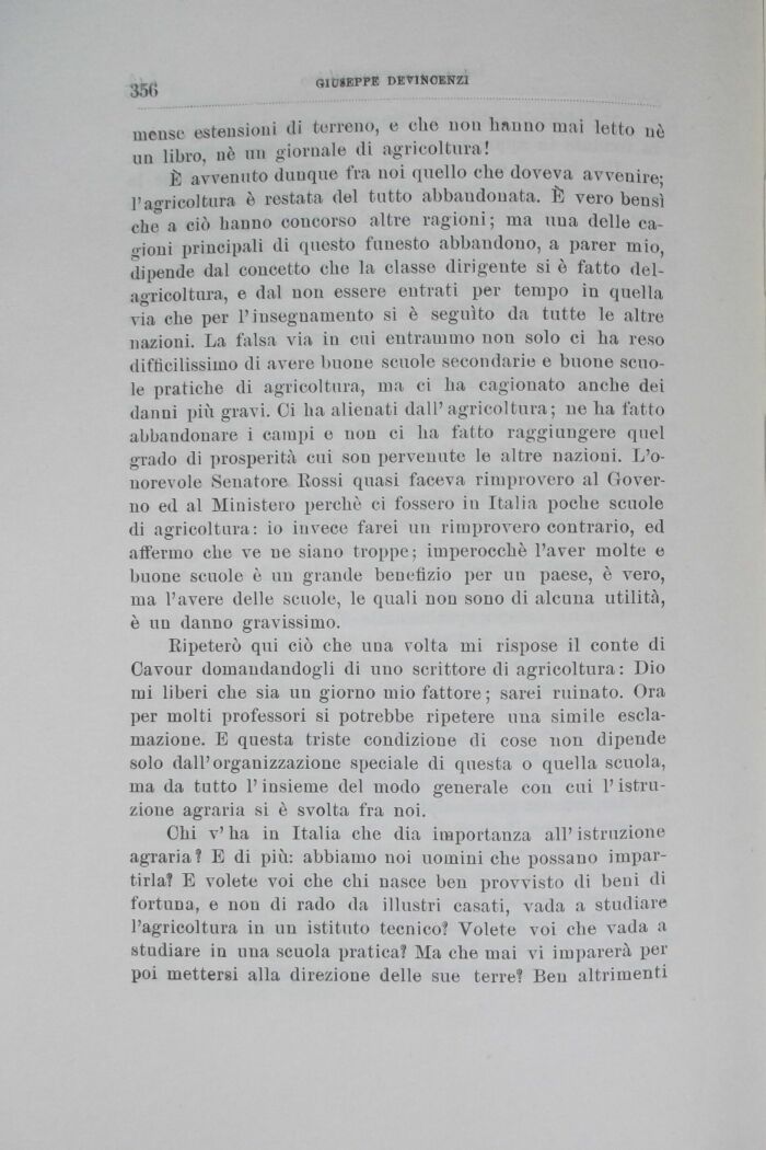 Chi v'ha in Italia che dia importanza all'istruzione agraria? E di più: abbiamo noi uomini che possano impartirla? E volete voi che chi nasce ben provvisto di beni di fortuna, e nou di rado da illustri casati, vada a studiare l'agricoltura in un istituto tecnico? Volete voi che vada a studiare in una scuola pratica? Ma che mai vi imparerà per poi mettersi alla direzione delle sue terre? Ben altrimenti