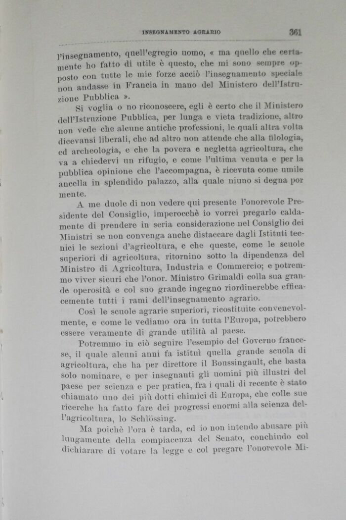 Si voglia o no riconoscere, egli è certo che il Ministero dell'Istruzione Pubblica, per lunga e vieta tradizione, altro non vede che alcune antiche professioni, le quali altra volta dicevansi liberali, che ad altro non attende che alla filologia, ed archeologia, e che la povera e negletta agricoltura, che va a chiedervi un rifugio, e come l'ultima venuta e per la pubblica opinione che l'accompagna, è ricevuta come umile ancella in splendido palazzo, alla quale niuno si degna poi-mente.