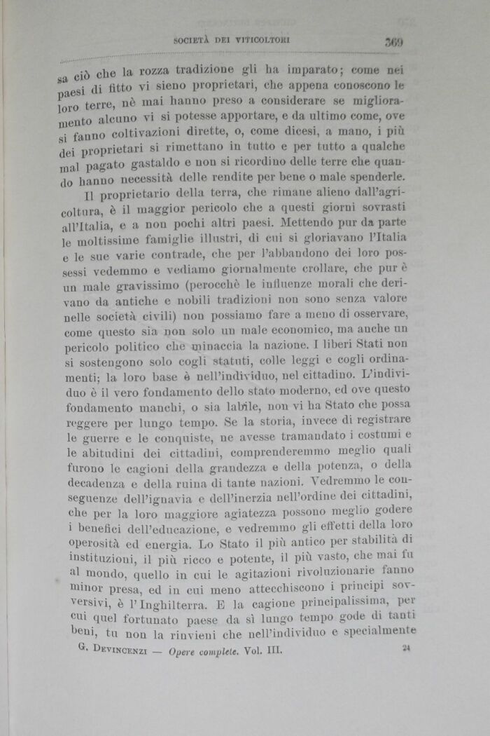 Il proprietario della terra, che rimane alieno dall'agricoltura, è il maggior pericolo che a questi giorni sovrasti all'Italia, e a nou pochi altri paesi. Mettendo pur da parte le moltissime famiglie illustri, di cui si gloriavano l'Italia e le sue varie contrade, che per l'abbandono dei loro possessi vedemmo e vediamo giornalmente crollare, che purè un male gravissimo (perocché le influenze morali che derivano da antiche e nobili tradizioni non sono senza valore nelle società civili) non possiamo fare a meno di osservare, come questo sia non solo un male economico, ma auche un pericolo politico che minaccia la nazione. I liberi Stati non si sostengono solo cogli statuti, colle leggi e cogli ordinamenti; la loro base è nell'individuo, nel cittadino. L'individuo ò il vero fondamento dello stato moderno, ed ove questo fondamento manchi, o sia labile, non vi ha Stato che possa reggere per lungo tempo. Se la storia, invece di registrare le guerre e le conquiste, ne avesse tramandato i costumi e le abitudini dei cittadini, comprenderemmo meglio quali furono le cagioni della grandezza e della potenza, o della decadenza e della ruina di tante nazioni. Vedremmo le conseguenze dell'ignavia e dell'inerzia nell'ordine dei cittadini, che per la loro maggiore agiatezza possono meglio godere i benefici dell'educazione, e vedremmo gli effetti della loro operosità ed energia. Lo Stato il più antico per stabilità di istituzioni, il più ricco e potente, il più vasto, che mai fu al mondo, quello in cui le agitazioni rivoluzionarie fanno minor presa, ed in cui meno attecchiscono i principi sovversivi, è l'Inghilterra. E la cagione principalissima, per cui quel fortunato paese da sì lungo tempo gode di tanti uem, tu non la rinvieni che nell'individuo e specialmente