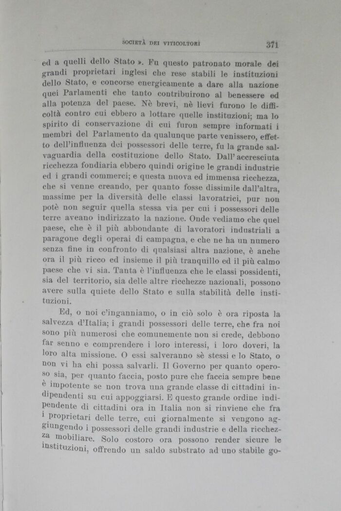 Ed, o noi c'inganniamo, o in ciò solo è ora riposta la salvezza d'Italia; i grandi possessori delle terre, che fra noi sono più numerosi che comunemente non si crede, debbono far senno e comprendere i loro interessi, i loro doveri, la loro alta missione. O essi salveranno sè stessi e lo Stato, o uon vi ha chi possa salvarli. Il Governo per quanto operoso sia, per quanto faccia, posto pure che faccia sempre bene è impotente se non trova una grande classe di cittadini indipendenti su cui appoggiarsi. E questo grande ordine indipendente di cittadini ora in Italia non si rinviene che fra 1 proprietari delle terre, cui giornalmente si vengono aggiungendo i possessori delle grandi industrie e della ricchezza mobiliare. Solo costoro ora possono render sicure le istituzioni, offrendo un saldo substrato ad uno stabile go-